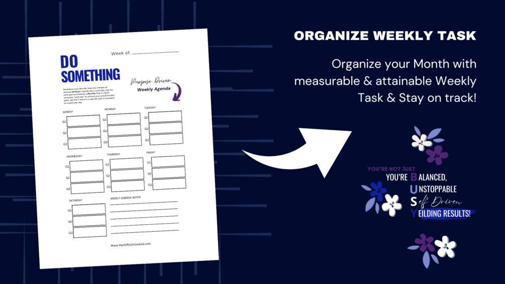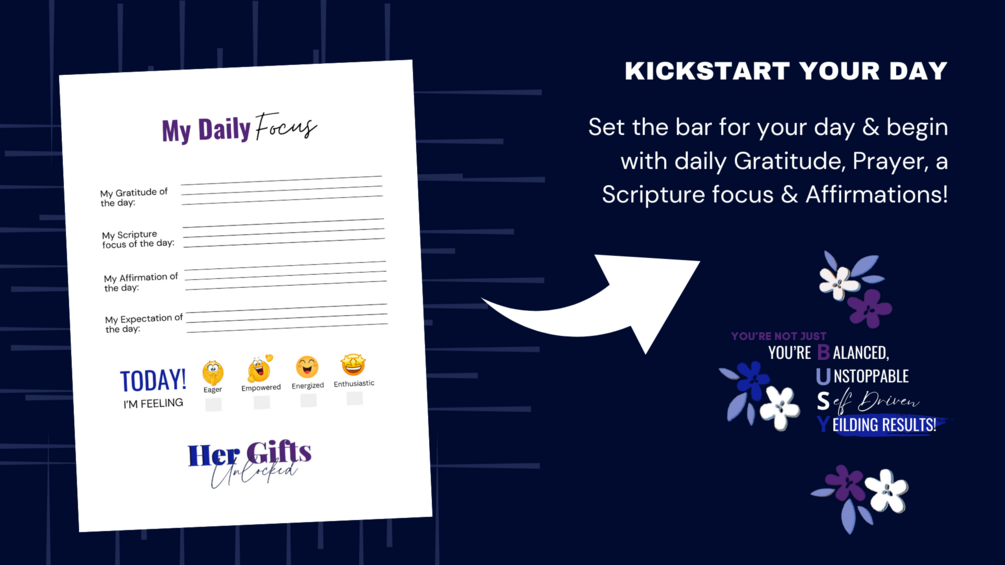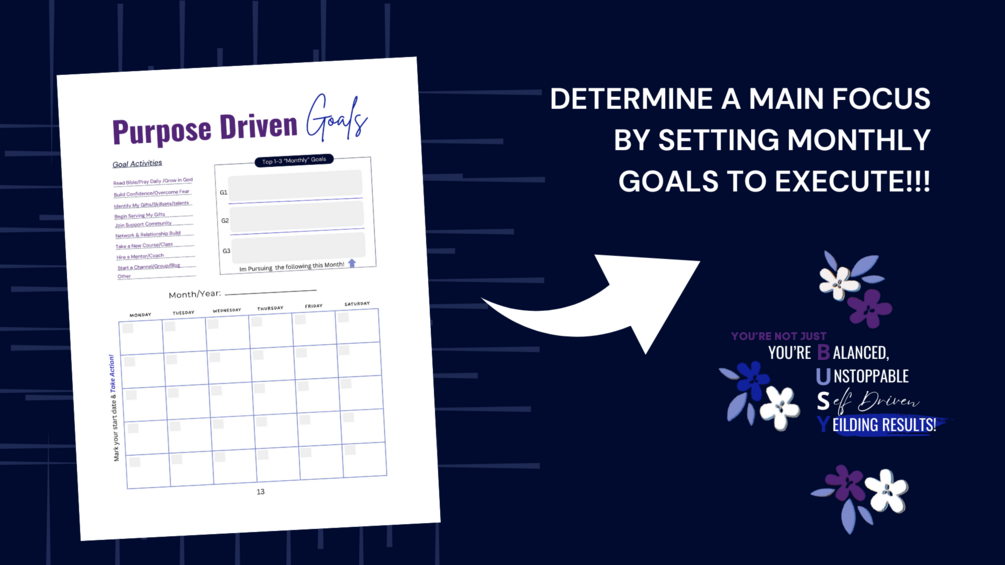 But that's not all – our journal goes beyond simple time management. It helps you kickstart your day with Gratitude, Prayer, A Scripture Focus, and Affirmations, fostering a mindset aligned with your purpose to kickstart everyday. Next, set a monthly goal, break it down into weekly targets, and seamlessly time block daily to focus your attention on your purpose and gifts and build the rest of your important/vital task of your daily life around God's idea for you existing.