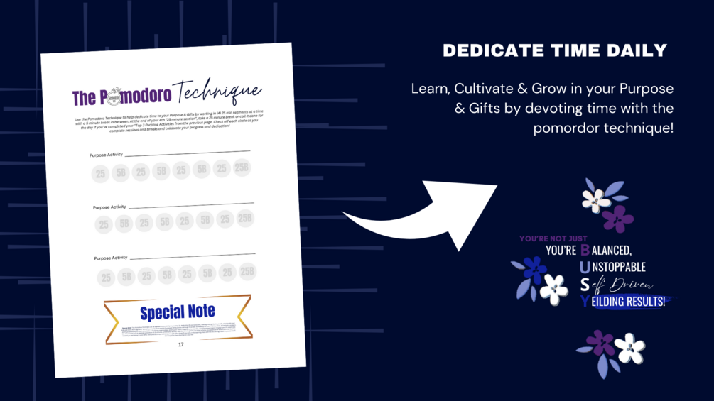 Featuring a unique time-blocking color-coded system, this journal enables you to allocate a portion of your day to essential daily Purpose Driven Activities, with a highlighted asterisk underscoring the critical nature of dedicating time to your purpose and gifts daily. Say goodbye to letting life's busyness overshadow the real power of your existence.