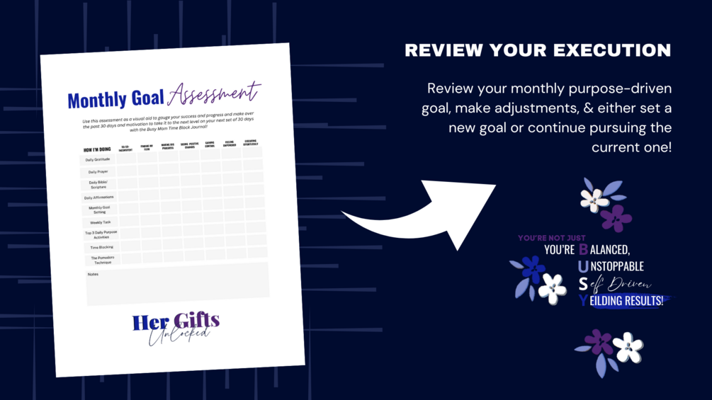 At the end of each month, our specially crafted assessment allows you to gauge your execution, celebrate your success, take accountability for your efforts, (or the lack thereof) and make necessary adjustments, and embark on another 30 days of purposeful living.
