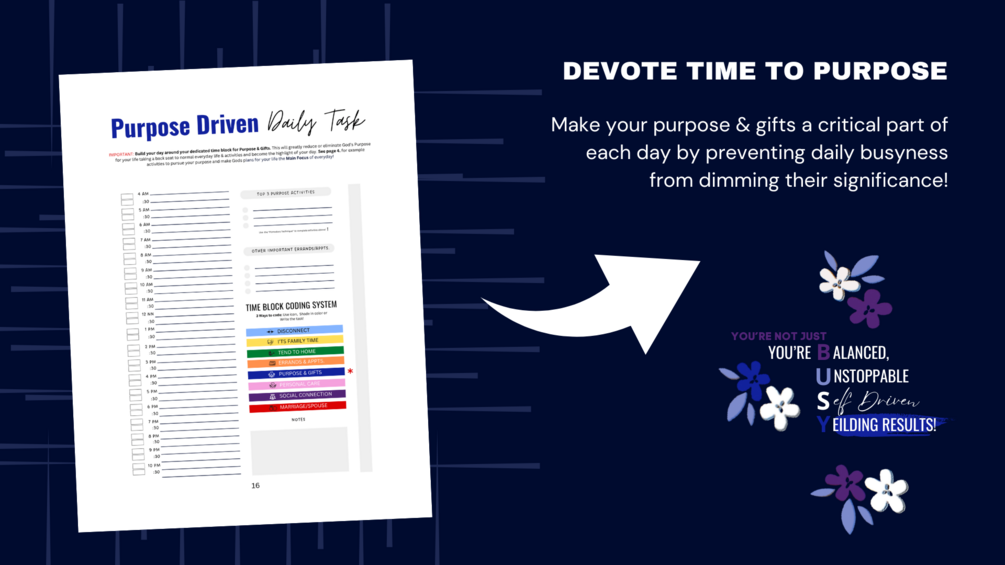 Take charge of your time, align with your purpose, and embrace a life of fulfillment with God with our Busy Mom Time Block Journal. It's not just a journal; it's your roadmap to a purpose-driven and leading where you've been gifted!